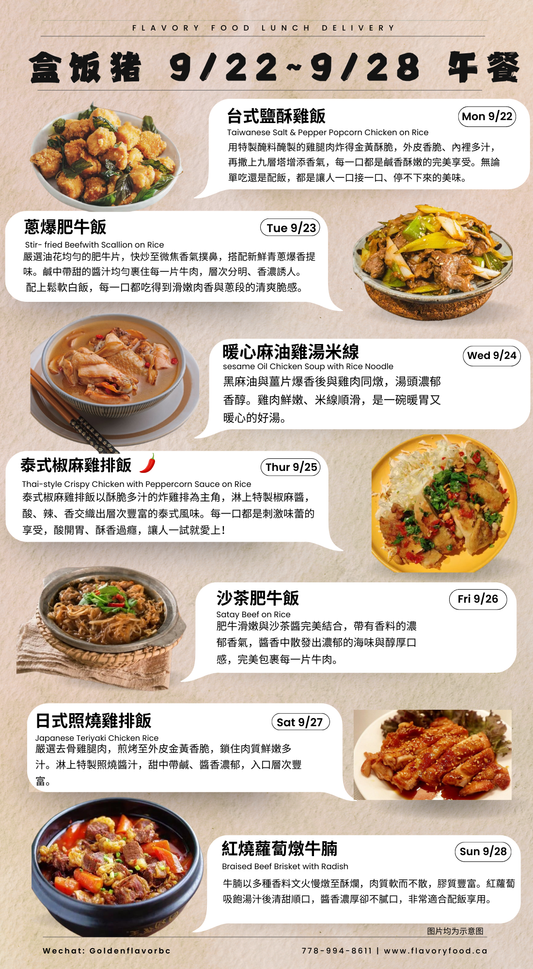 周一至周五免费配送温哥华,列治文,本那比,新西敏,高贵林和素里,每日享受不同美味午餐。